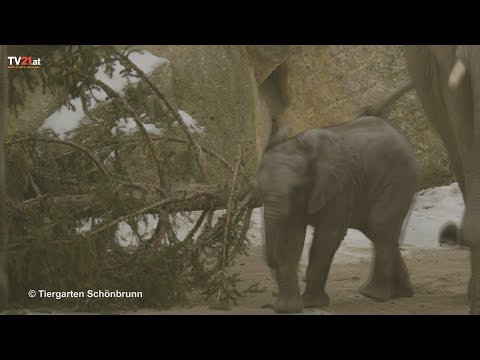 Wo vor kurzem noch tausende Lichter funkelten, sorgt die Schönbrunner Weihnachtsfichte jetzt für strahlende Elefantenaugen.